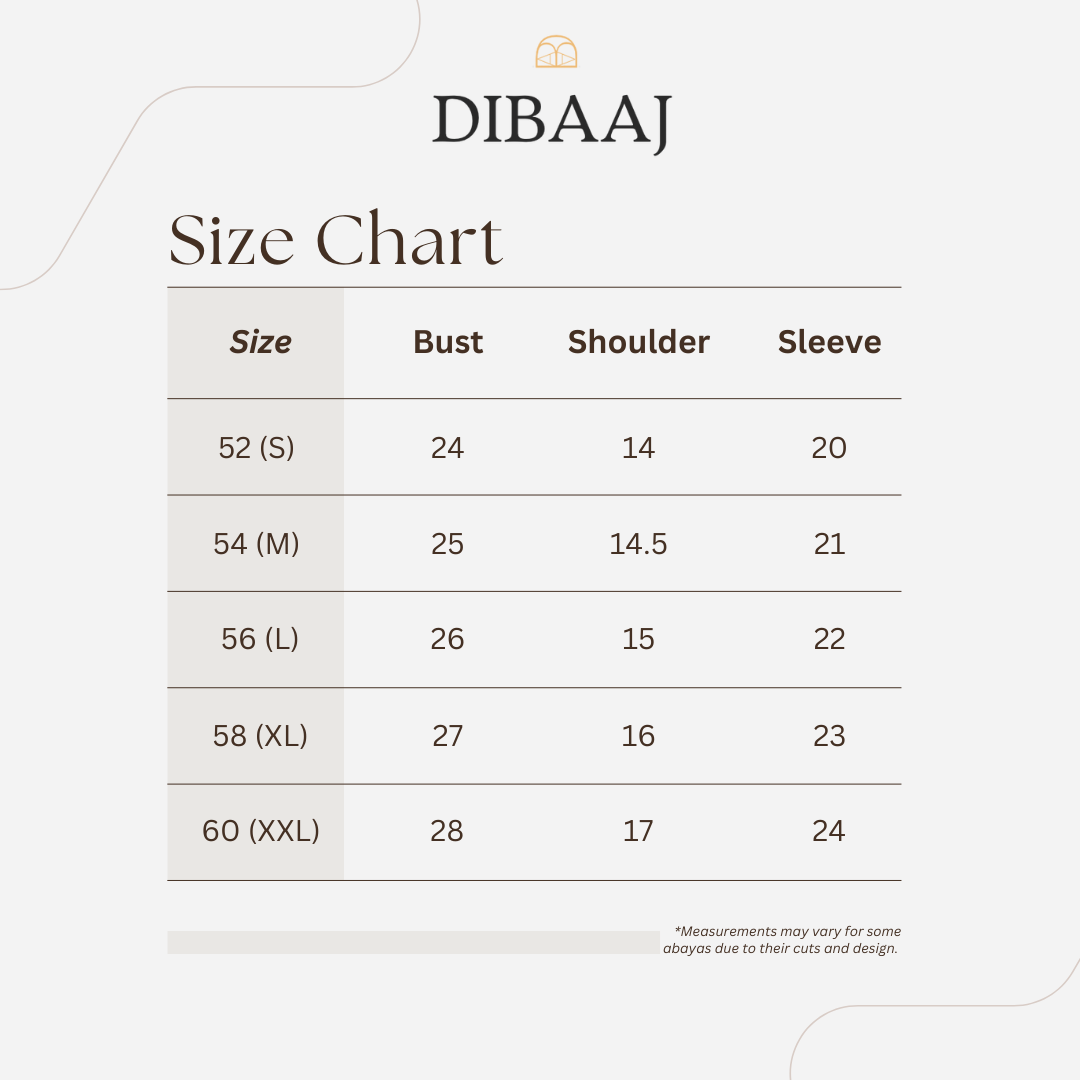 Find your perfect fit with our detailed size chart. Measure carefully to ensure your abayas fit comfortably and elegantly. For the best results, compare your measurements with our chart.